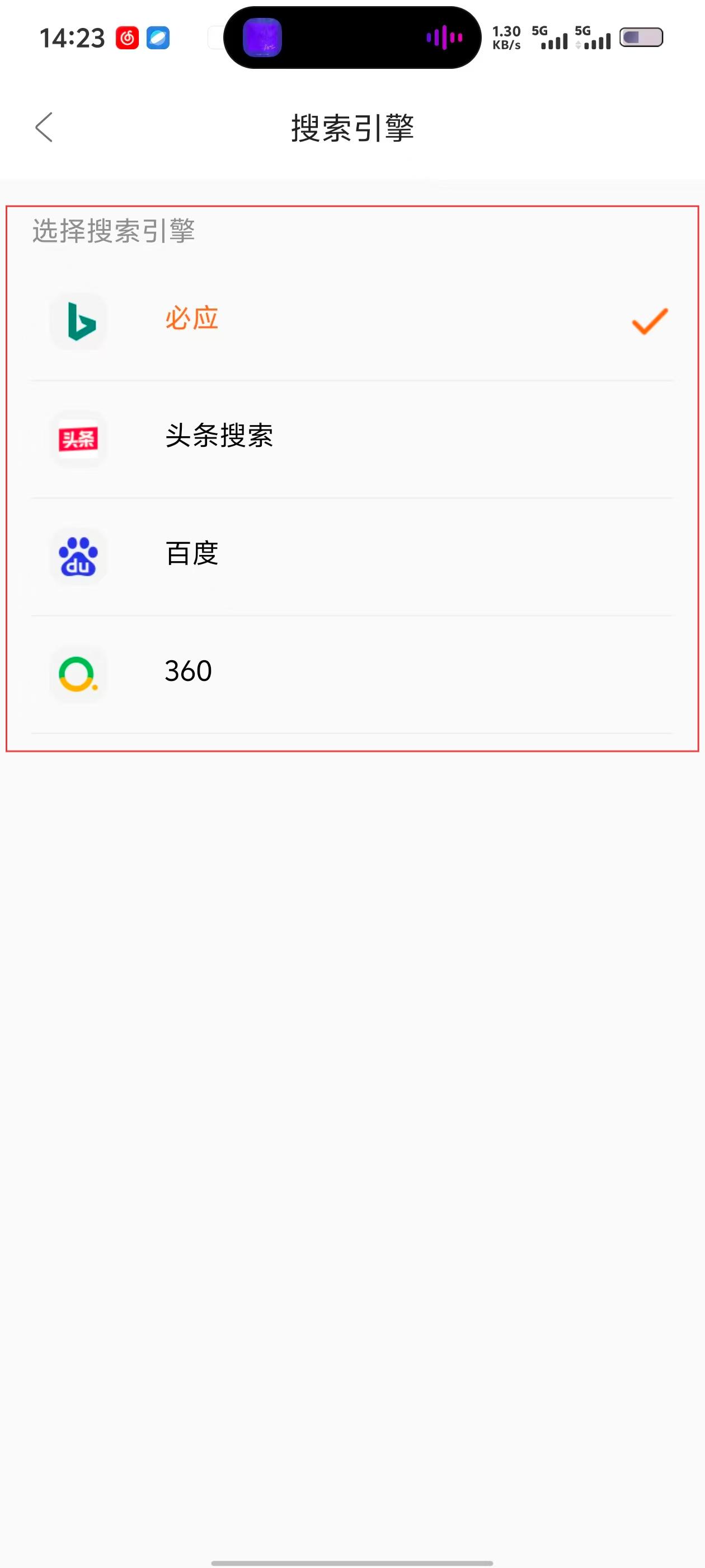 4、在搜索引擎选择页面,可根据需求选择【必应】【头条搜索】【百度】【360】中的任意一个作为默认搜索引擎。