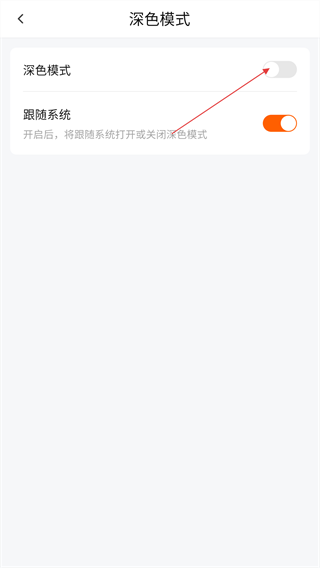 4、在【深色模式】页面,可点击【深色模式】开关按钮开启或关闭该模式,也可开启【跟随系统】功能让模式随系统设置变化。