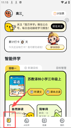 3、开始学习,点击首页“自然拼读”模块,开始智能伴学。