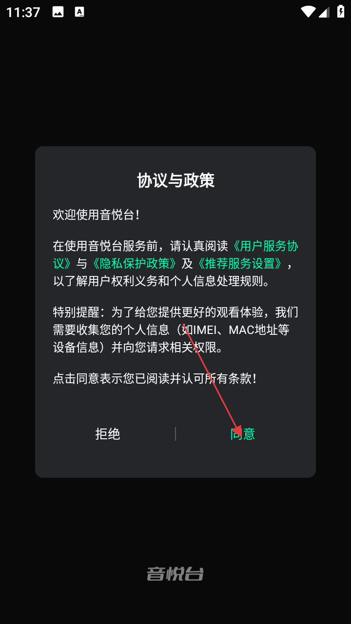 1、首次使用音悦台,会弹出【协议与政策】提示框,阅读后点击【同意】即可进入。