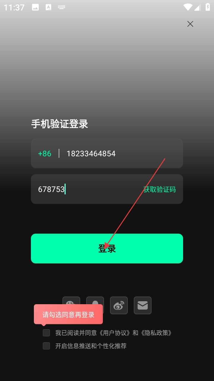4、填好手机号与验证码后,勾选同意相关协议,点击【登录】按钮,完成登录操作。