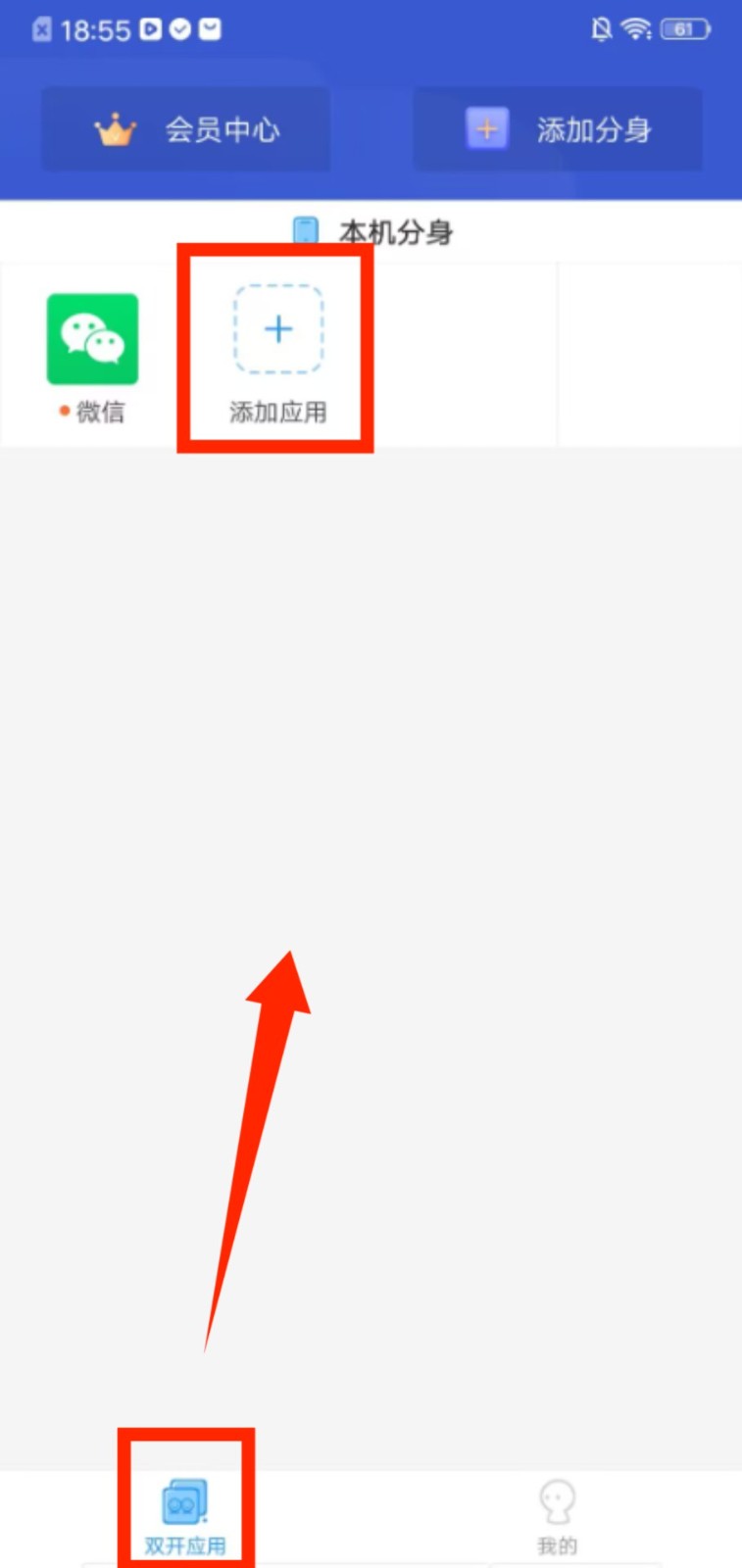 2、切换到双开应用页面,点击 “添加应用” 按钮,进入应用列表页面选择需双开的程序。