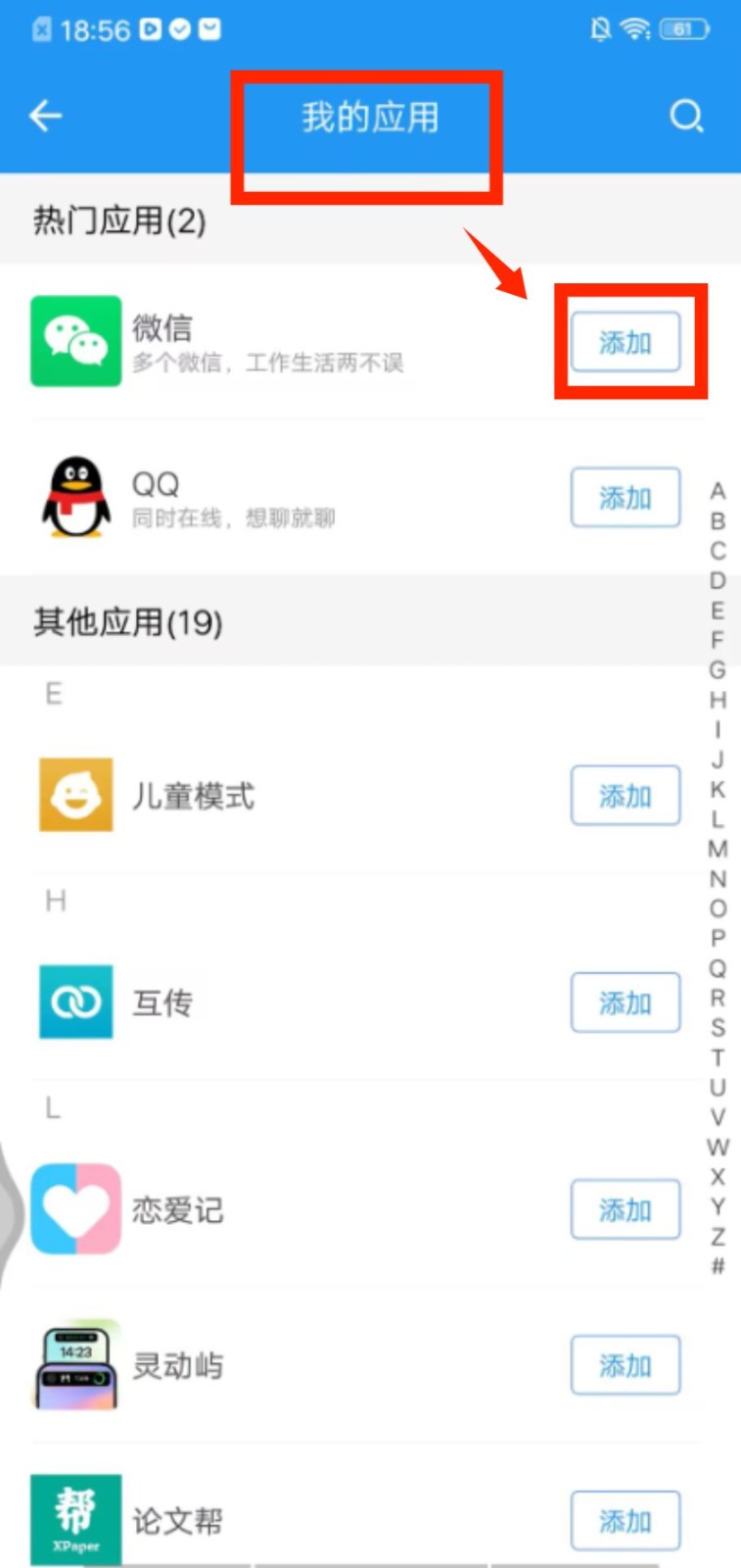 3、打开我的应用页面,在热门应用或其他应用分类下,点击对应程序旁的 “添加” 完成双开配置。