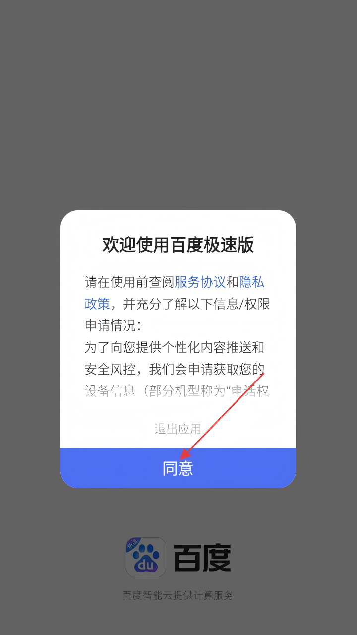 1、打开百度极速版APP,首先会弹出欢迎使用的提示框,点击【同意】。
