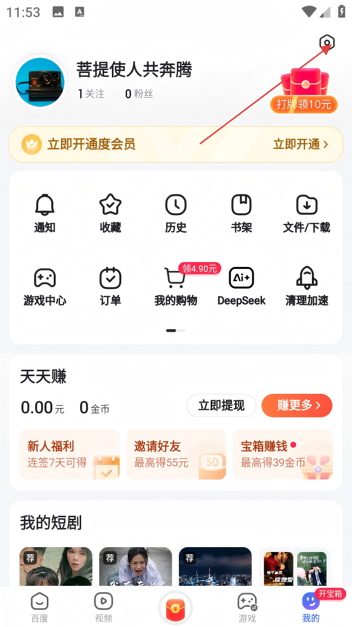3、在“我的”页面,点击右上角的设置图标,进入设置界面。
