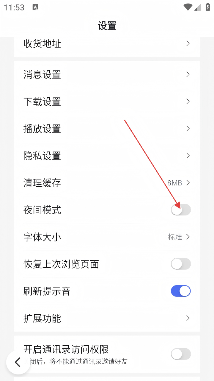 4、在设置界面中,找到【夜间模式】选项,点击其右侧的开关按钮,即可开启或关闭夜间模式。