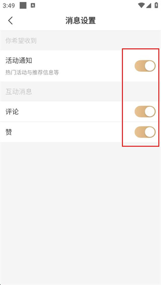 4、在消息设置页面,可对【活动通知】【评论】【赞】等消息通知开关进行设置,按需开启或关闭。