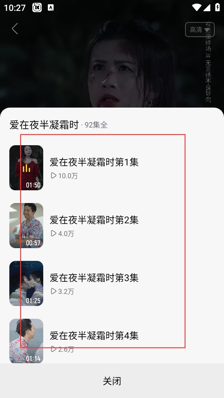 3、点击剧集列表后,可查看《爱在夜半凝霜时·92集全》的剧集列表,选择想看的集数。