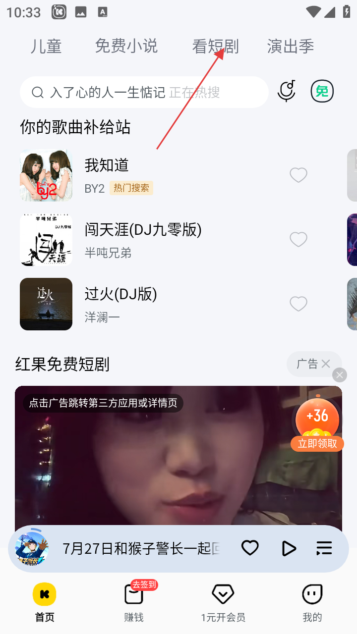 1、打开酷我音乐,在首页顶部点击【看短剧】选项,进入看短剧板块,可看到短剧推荐内容。