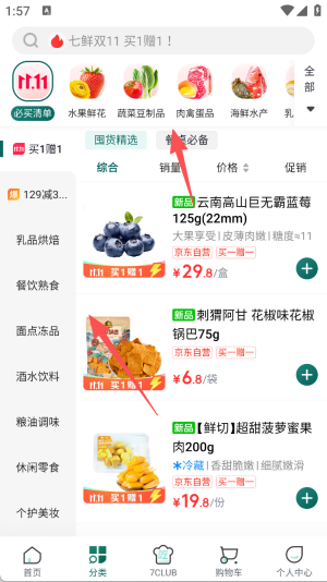 2、进入京东七鲜界面,点击七鲜板块,可查看新人限时专享价、新人多单礼等优惠信息。
