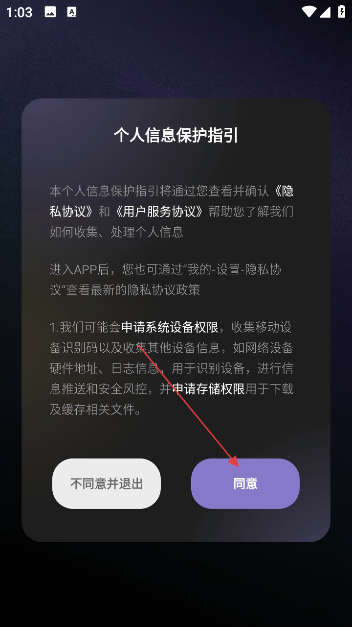 1、打开撕歌,首先弹出【个人信息保护指引】弹窗,阅读后点击【同意】。