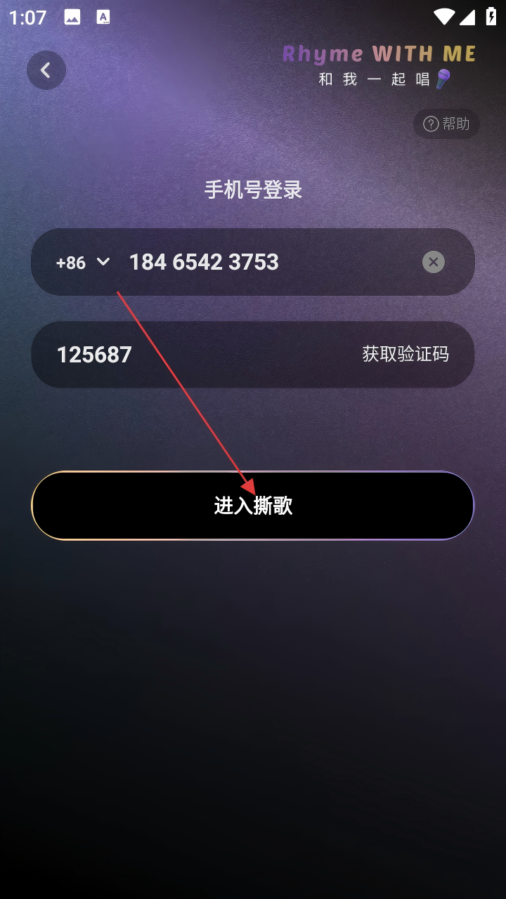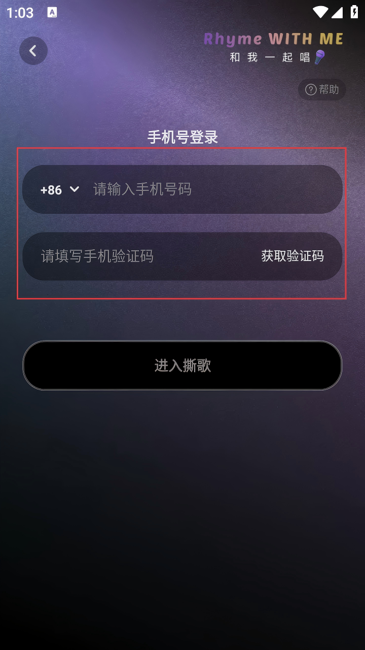 4、收到验证码后,在【请填写手机验证码】输入框中填写验证码,最后点击【进入撕歌】,即可完成登录。