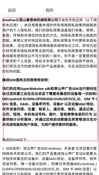 4、进入【我的】页面的【隐私政策】,能查看OmoFun软件的隐私保护、SDK服务及权限使用说明,明确个人信息使用规范。