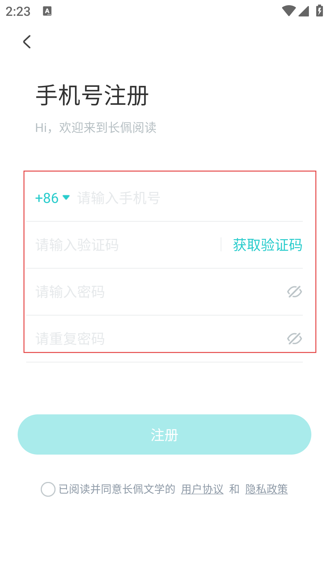 4、在手机号注册页面依次输入手机号、验证码、密码并重复密码,勾选协议后点击【注册】完成注册。