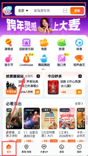 1、回到应用首页,顶部有演唱会、话剧音乐剧等分类,下方展示抢票播报、必看演出等内容。