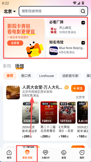 2、点击底部 “影院场馆” 选项,进入后可看到影院卡券包入口,下方是场馆推荐列表及对应演出信息。
