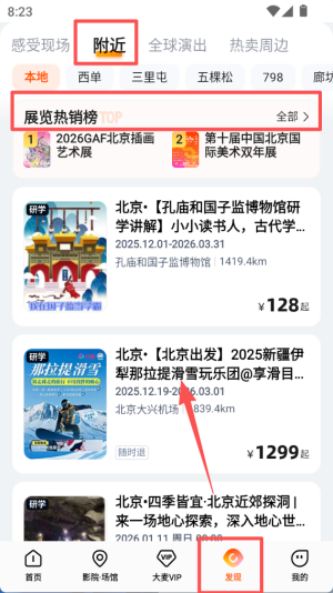 3、切换到底部 “发现” 页面,点击 “附近” 标签,能看到展览热销榜,还有本地的研学、旅游等活动推荐。