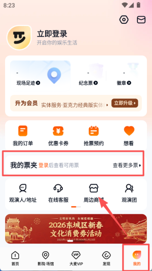 4、再次进入 “我的” 页面,可看到 “我的订单”“抢票预约” 等功能,还有我的票夹及观演相关服务入口。