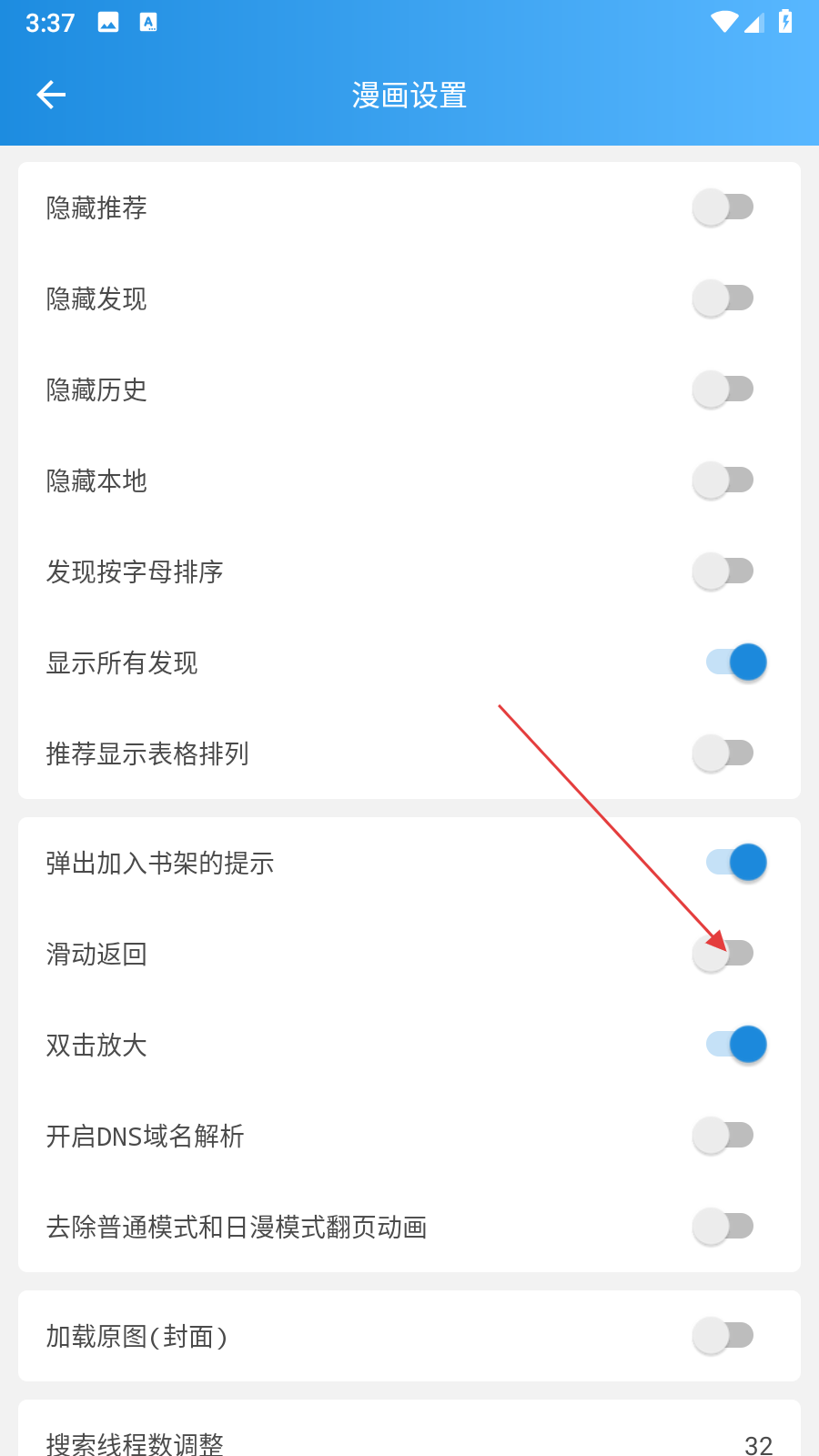 4、在漫画设置页面找到【滑动返回】选项,开启该功能,可通过滑动操作返回上一级页面,提升操作便利性。