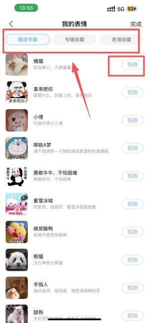 3、在我的表情界面,可对精选专辑、专辑收藏等中的表情进行移除操作,管理个人表情。