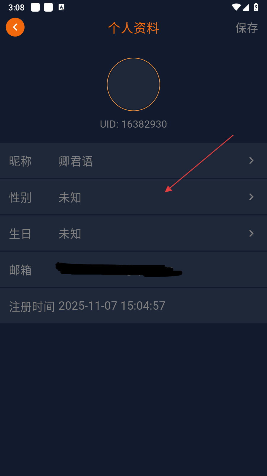 4、在个人资料页面,点击性别进行设置,点击【保存】即可完成个人资料更新。