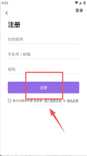 3、在注册页面,填写昵称、手机号/邮箱和密码后点击“注册”,即可完成账号注册。
