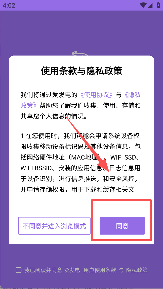 1、在使用条款与隐私政策页面,阅读相关内容后点击“同意”,即可进入后续操作。