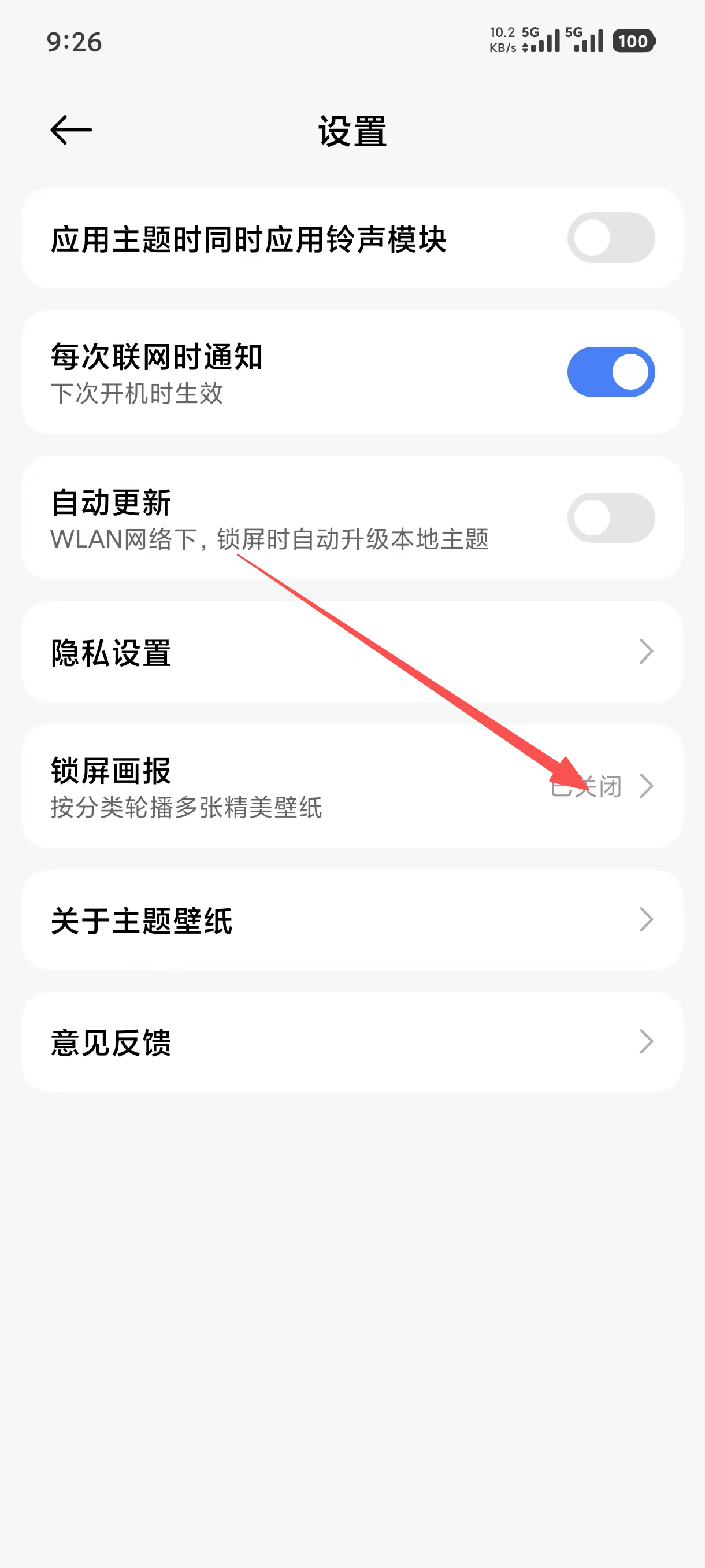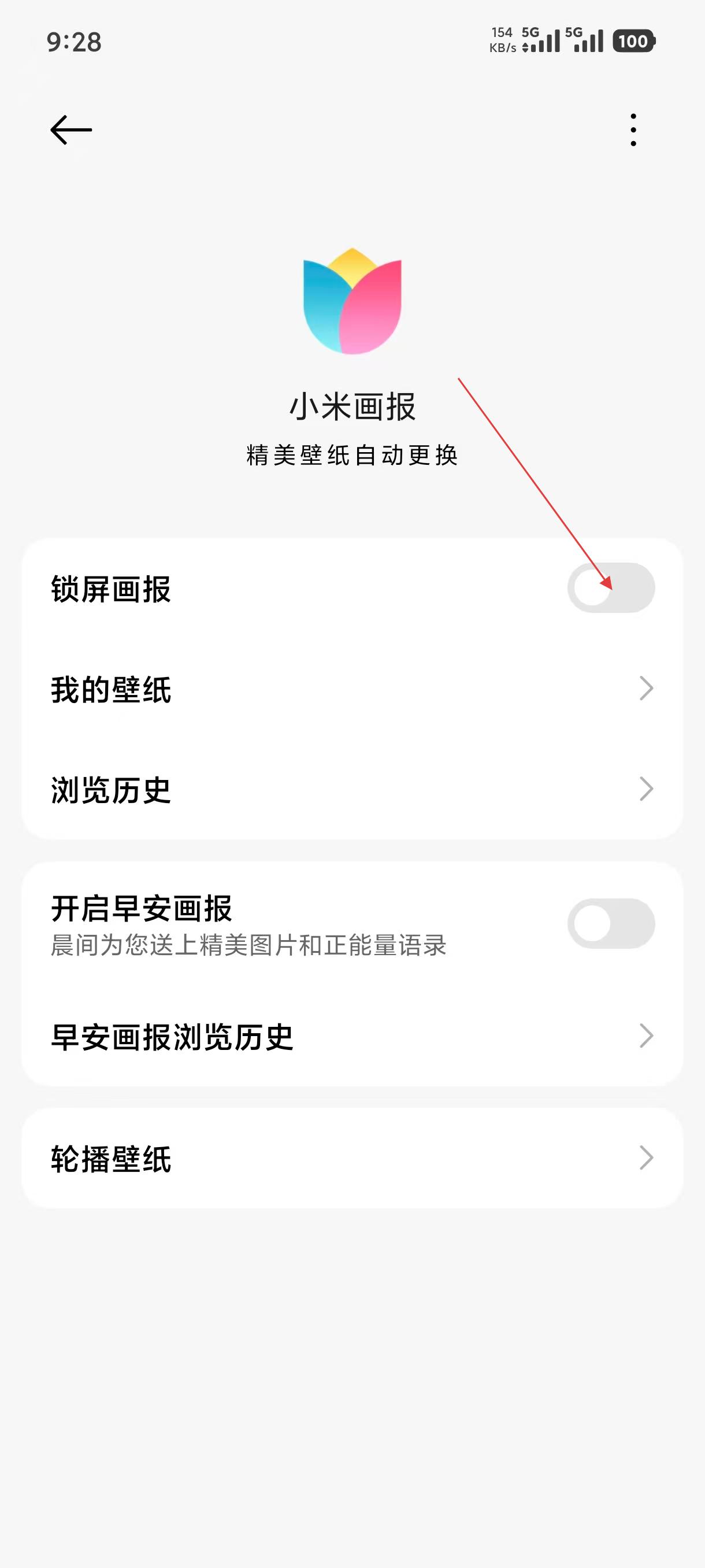 3、在设置界面中,点击【锁屏画报】选项,进入锁屏画报设置界面,可开启或关闭锁屏画报功能。