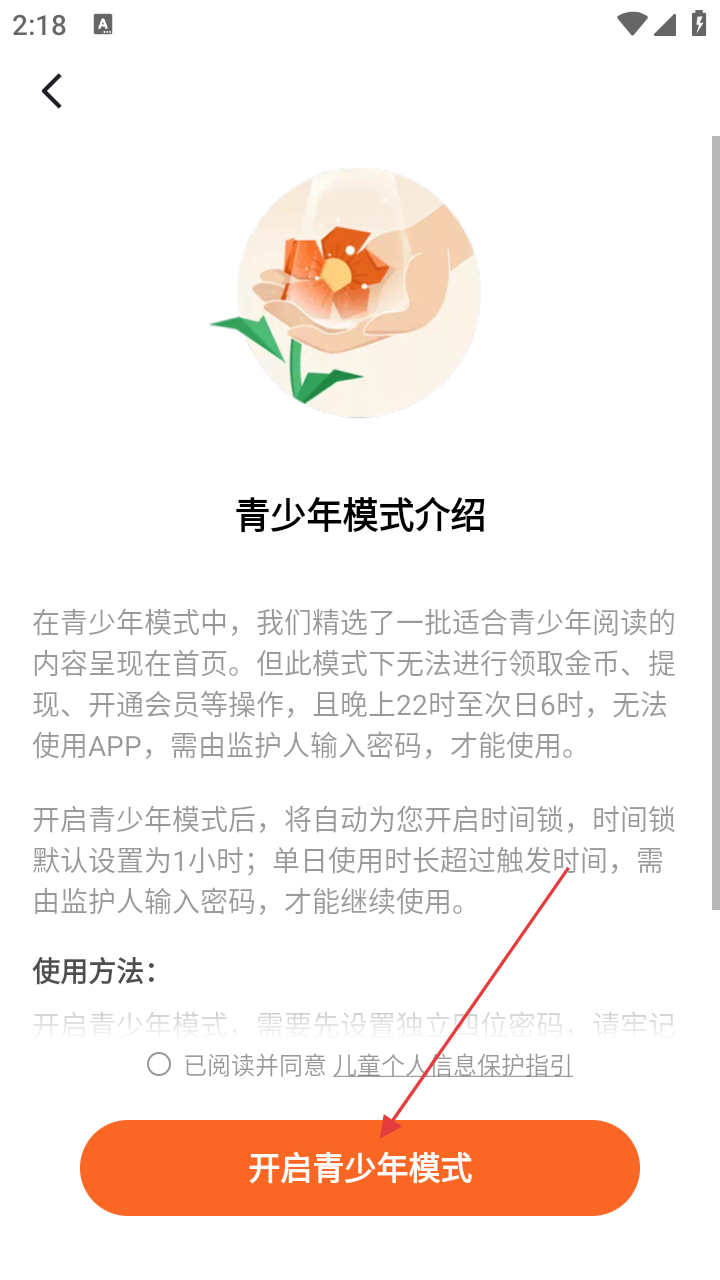 4、在青少年模式介绍页面,点击【开启青少年模式】按钮,开启该模式。