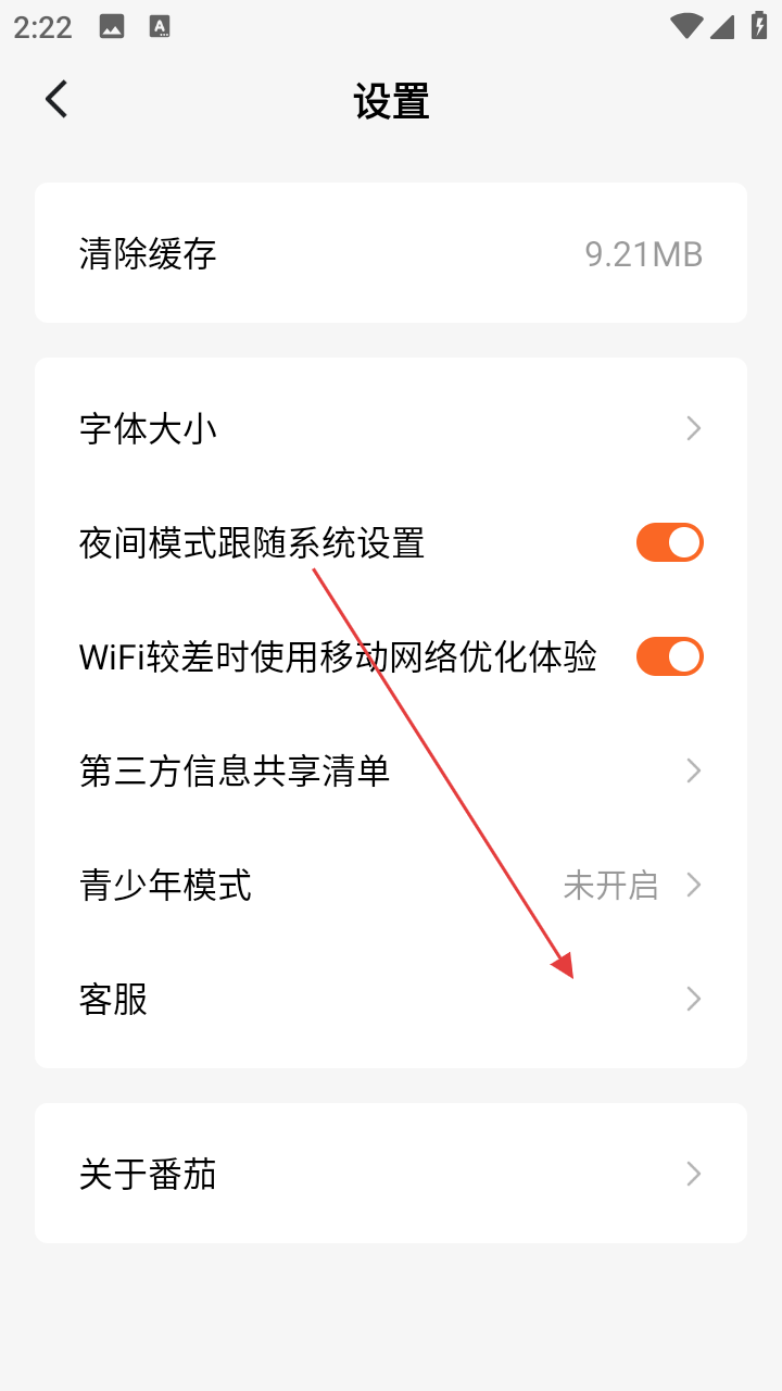 3、进入设置后,找到并点击【客服】。