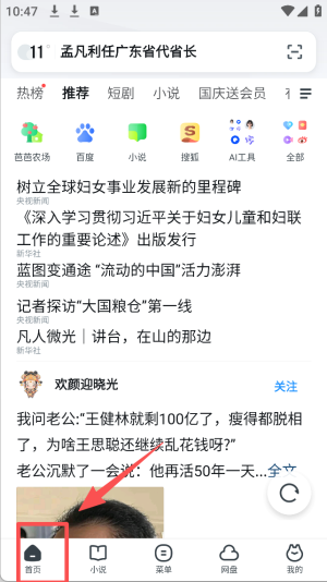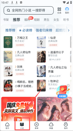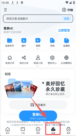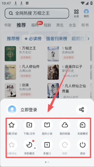1、点开UC图标后,先滑到“小说”栏,轻触“书架”把万相之王收进私仓。