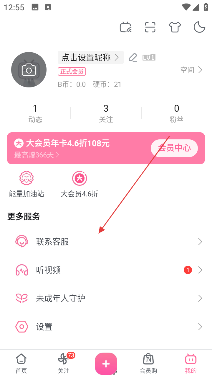2、在个人页面,找到【联系客服】选项并点击,进入客服中心页面。