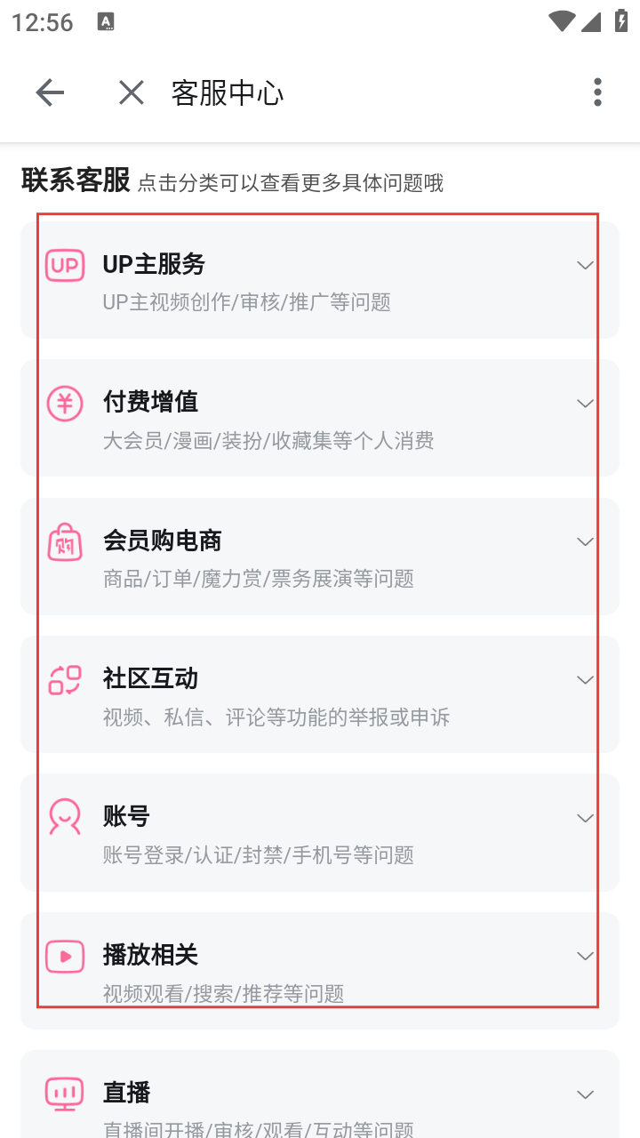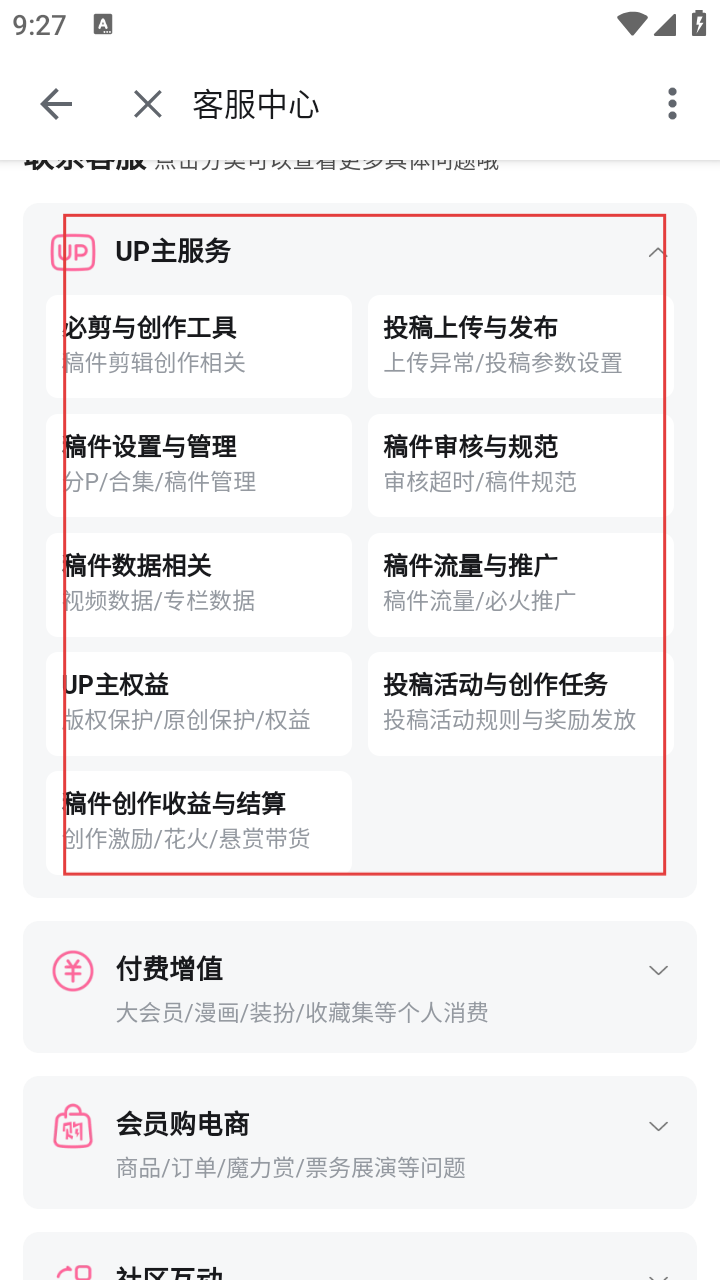 3、在客服中心,可看到【UP主服务】【付费增值】等多个服务分类,涵盖不同类型问题咨询。