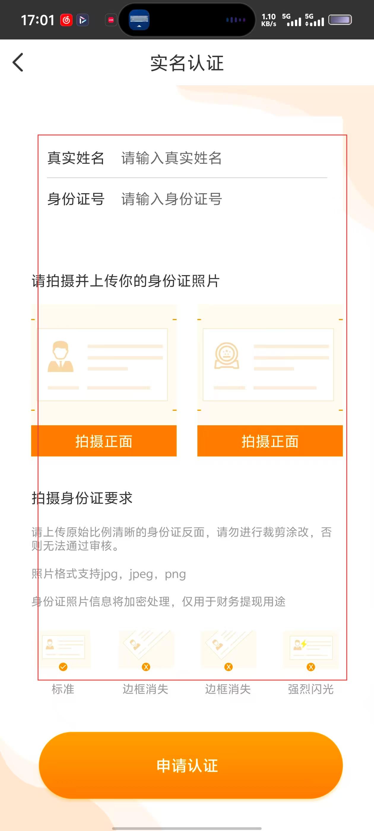 4、在实名认证界面,输入真实姓名和身份证号,拍摄并上传身份证正反面照片后点击【申请认证】,即可完成实名认证流程。