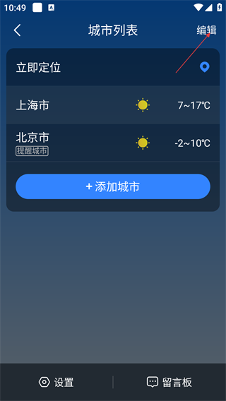 2、在城市列表页面,点击右上角的【编辑】按钮,进入城市编辑模式。