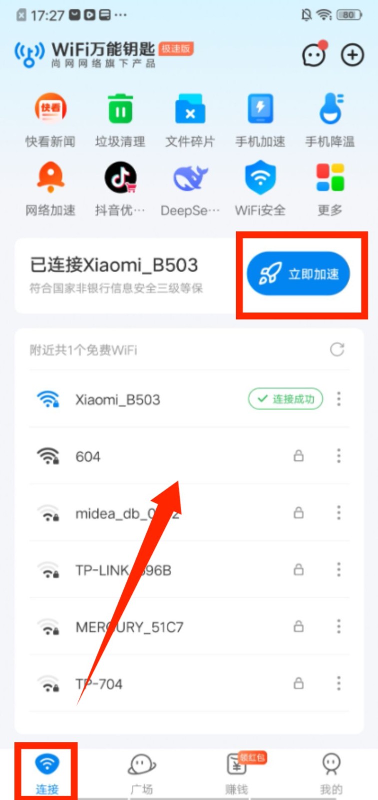 1、进入 “连接” 页面,找到已连 WiFi 后点击 “立即加速”,可优化当前网络的运行状态。
