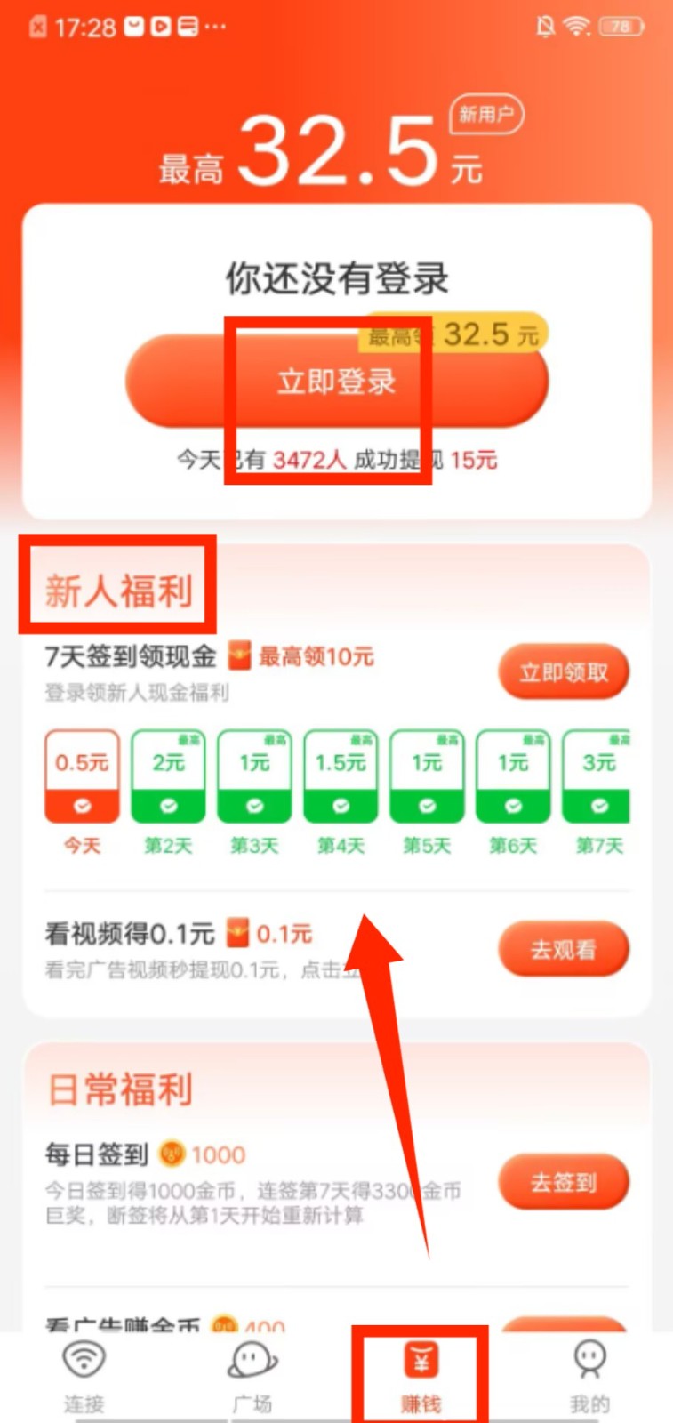3、打开 “赚钱” 页面,点击 “立即登录” 后,可参与新人福利、日常福利等任务获取奖励。