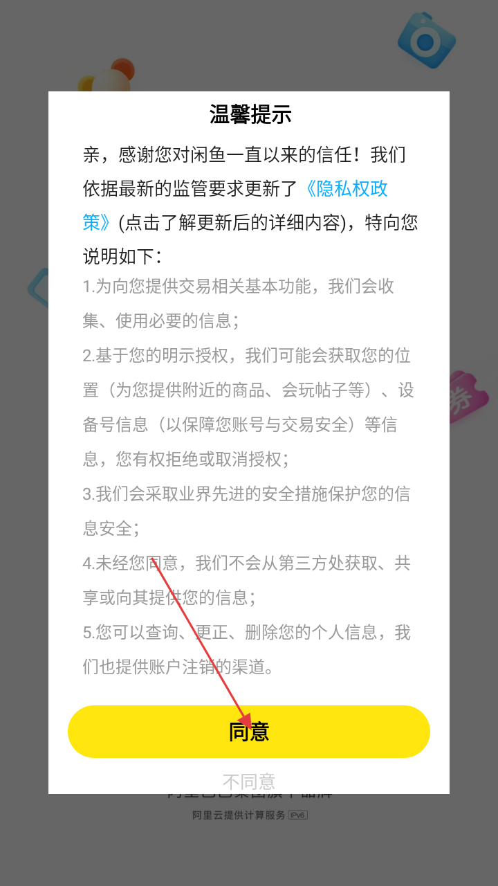 1、打开闲鱼APP,弹出隐私政策温馨提示,阅读后点击【同意】按钮。