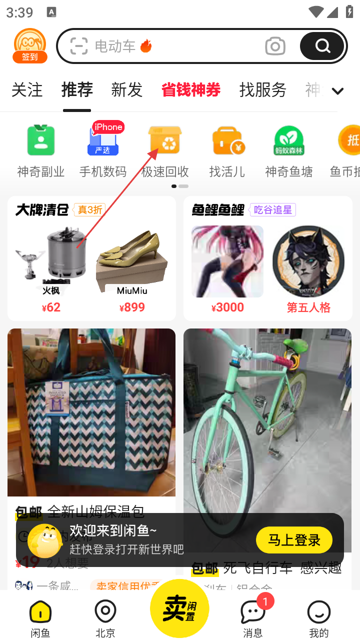 2、进入闲鱼首页后,点击【极速回收】图标,进入回收相关页面。