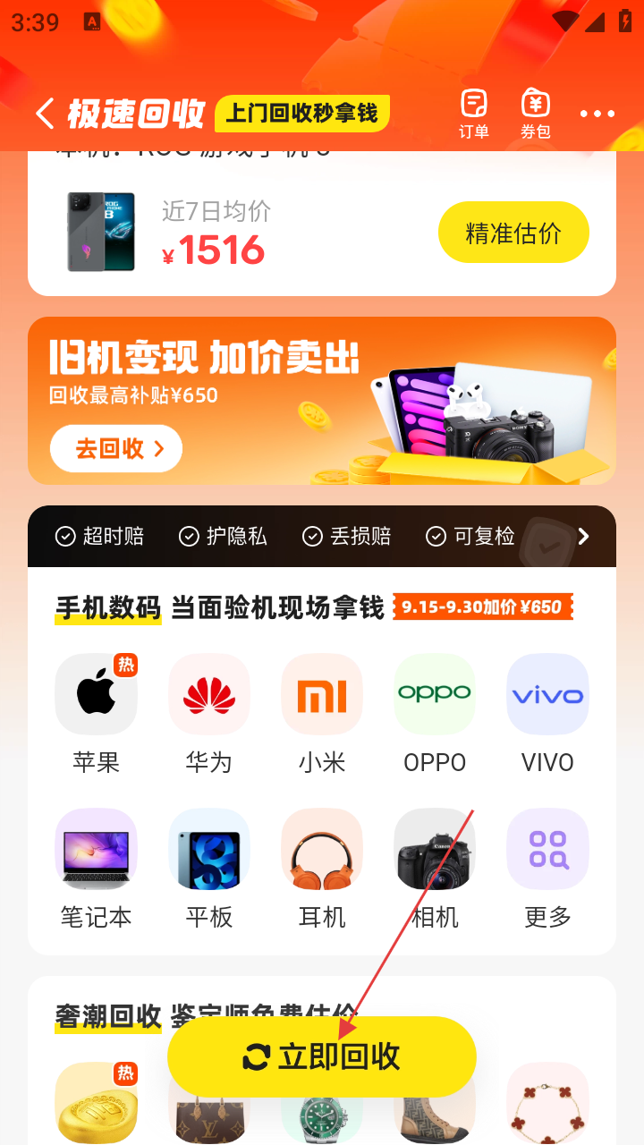 3、在极速回收页面,点击黄色的【立即回收】按钮,推进回收流程。
