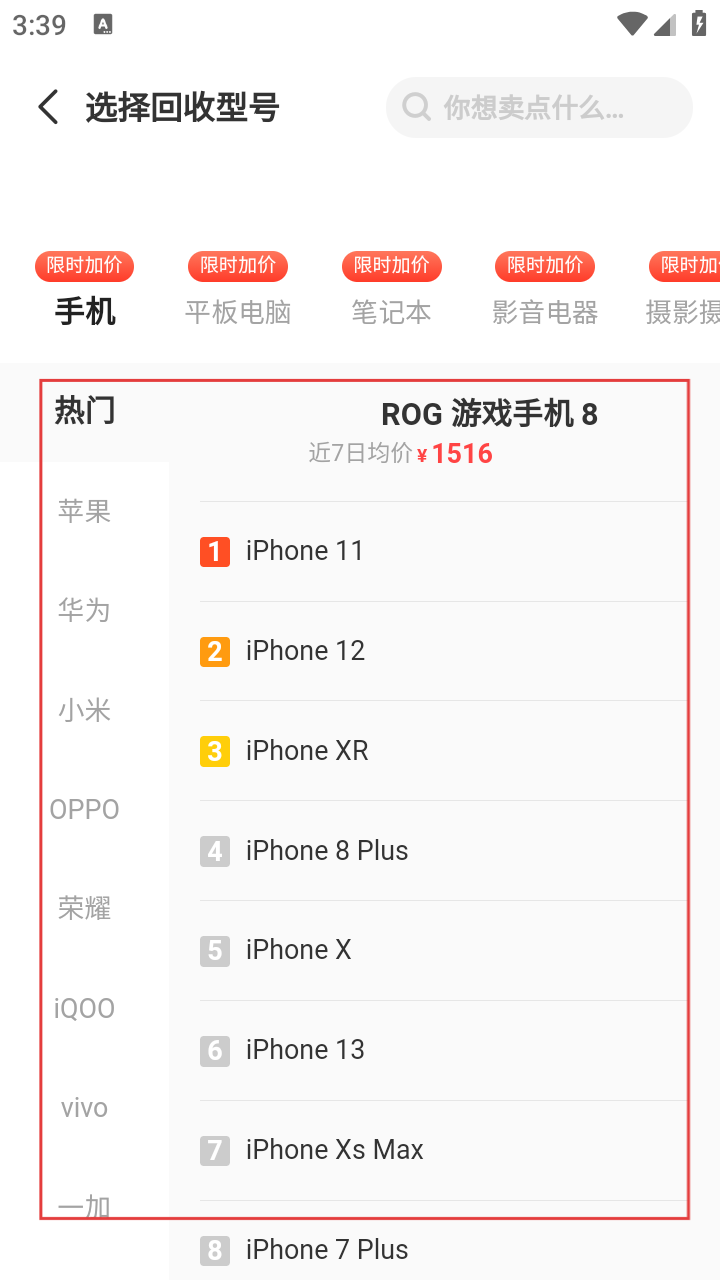 4、进入选择回收型号页面,在热门手机列表中,可选择如【iPhone-11】等型号进行回收。