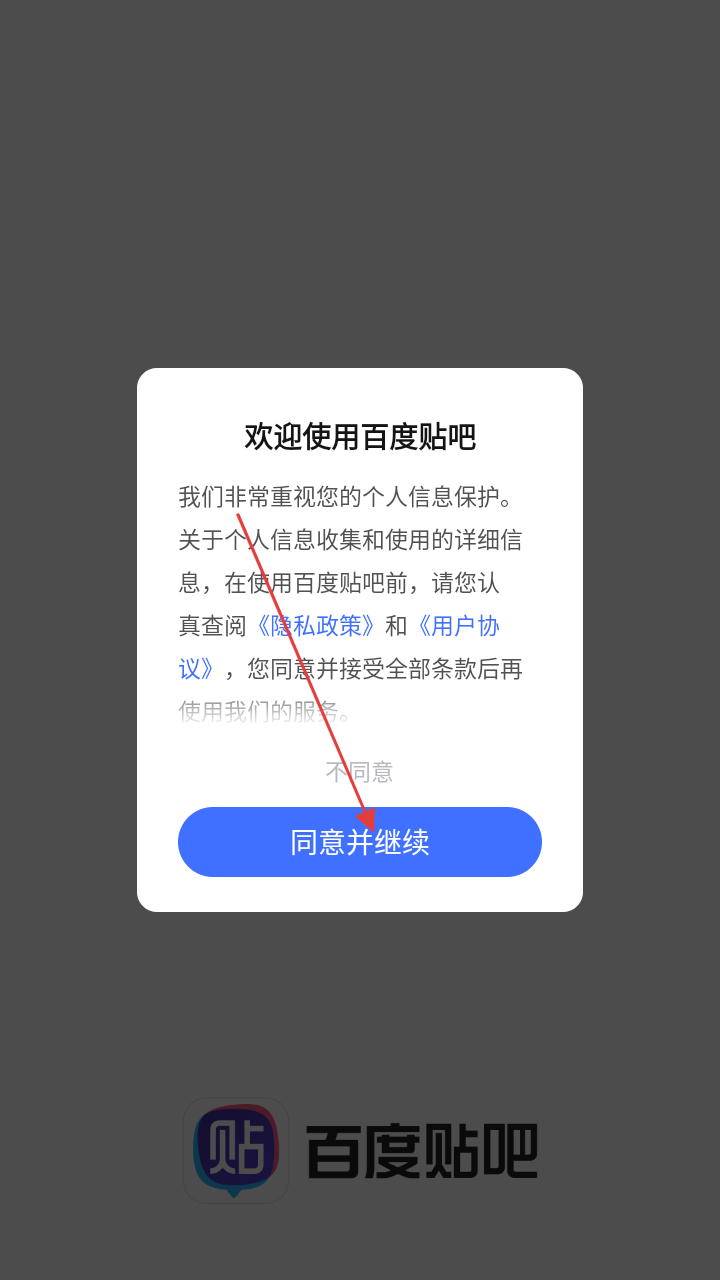 1、打开百度贴吧APP,首先会看到“欢迎使用百度贴吧”页面,仔细阅读相关内容后,点击【同意并继续】按钮。