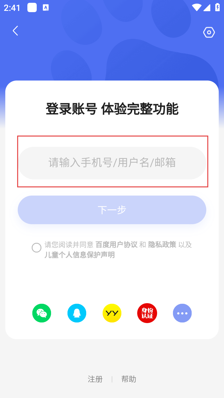 4、勾选“请您阅读并同意 百度用户协议 和 隐私政策 以及 儿童个人信息保护声明”,然后点击【下一步】按钮,按照提示完成后续登录操作。