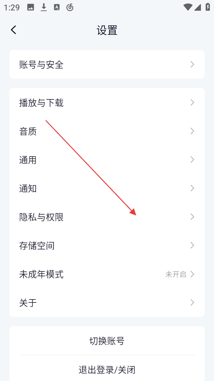 3、进入设置页面,有账号与安全、播放与下载等选项,点击【隐私与权限】,可进行隐私相关设置。