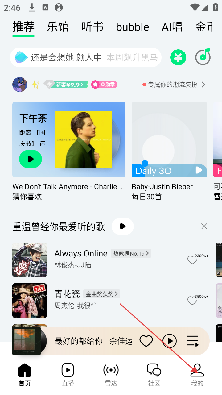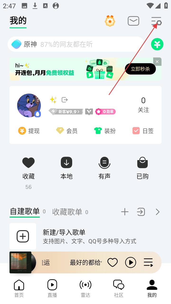 1、打开qq音乐软件,进入首页后,点击右下角【我的】,进入个人相关页面。