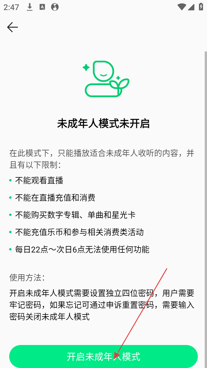4、在未成年人模式相关页面,查看模式介绍后,点击【开启未成年人模式】,进行模式开启操作。