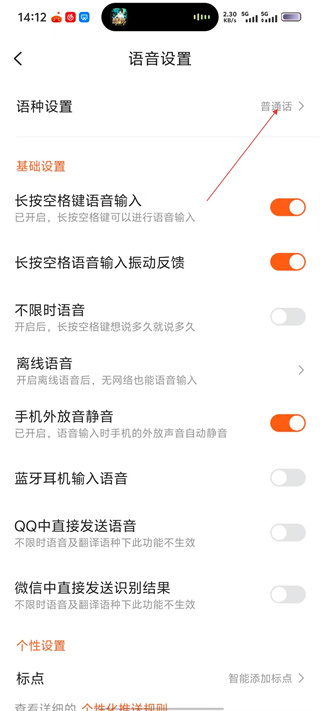 4、在【语音设置】中,可设置【语种】,还能对【长按空格键语音输入】【振动反馈】等功能进行开关设置,优化语音输入体验。