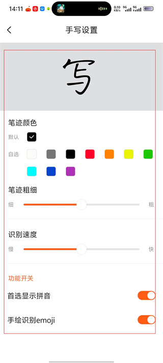 4、在【手写设置】中,可设置【笔迹颜色】等,还能开启【首选显示拼音】【手绘识别emoji】等功能,优化手写体验。