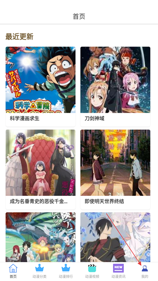2、在首页【最近更新】板块,可查看《科学漫画求生》《刀剑神域》等新动漫,点击底部【我的】。