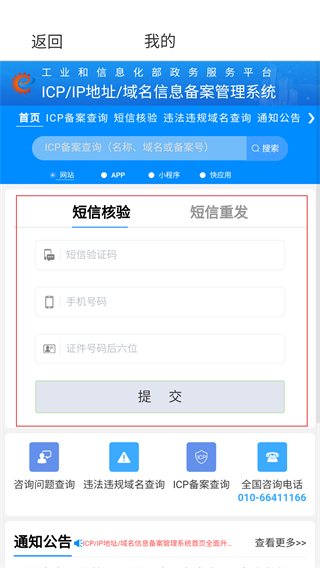 4、进入【APP备案号】页面,可通过工业和信息化部政务服务平台的ICP备案查询系统,输入验证码、手机号等信息验证备案的真实性。